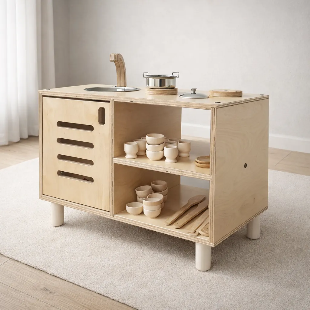 העיצוב המינימליסטי והבטיחותי מזמין ילדים לבלות שעות של משחק דמיון מרתק, "לבשל" ולחקות את עולם המבוגרים בצורה חווייתית ומהנה. המדפים הפתוחים מאפשרים לילדים לסדר את כלי המשחק בעצמם, ומעודדים עצמאות וסדר.